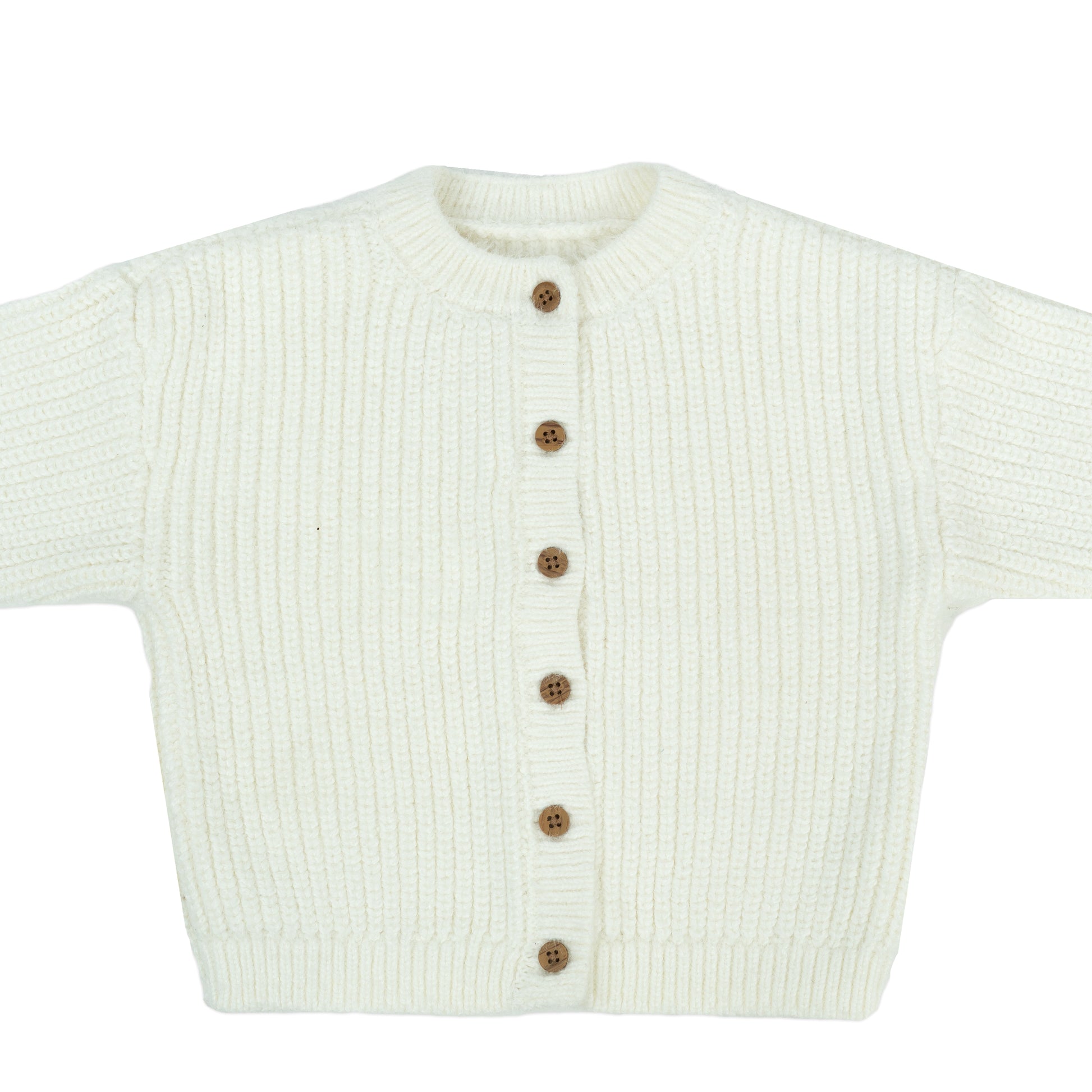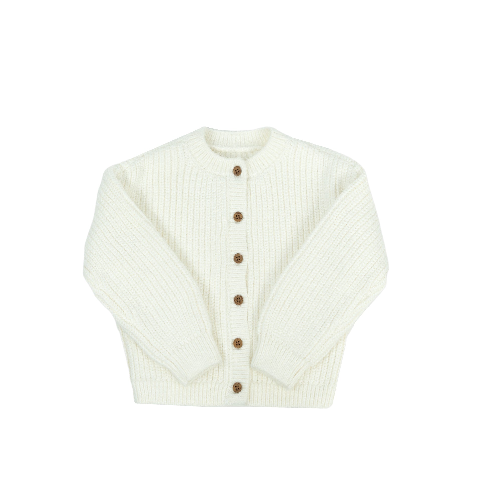This timeless off-white ribbed knit cardigan is a versatile and essential piece for your child's wardrobe. Its cozy texture and classic design make it perfect for layering, adding warmth and understated elegance to any outfit.