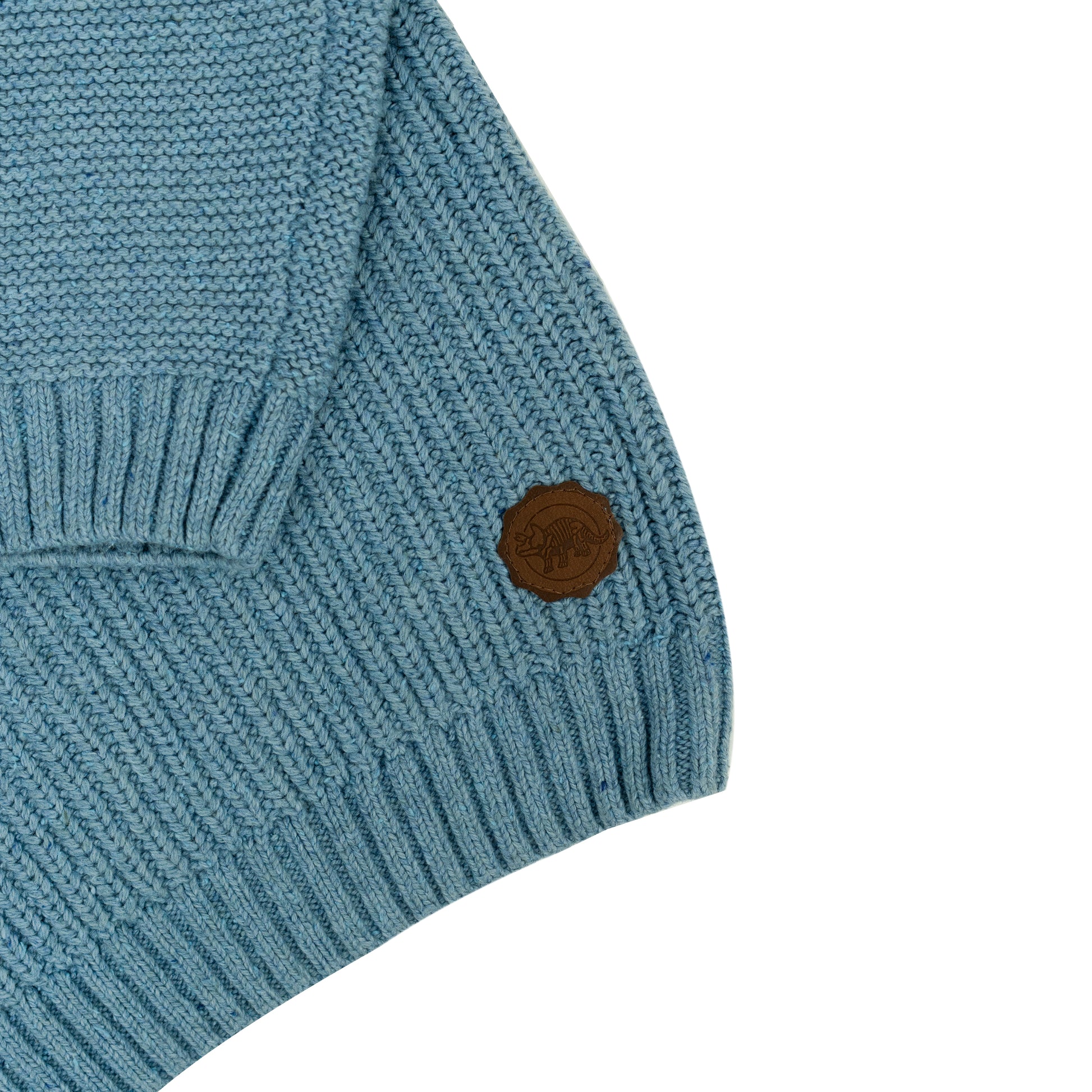 This versatile medium blue ribbed knit sweater offers timeless style and cozy comfort for your child. Its classic design makes it a perfect staple for any wardrobe, easily paired with various outfits for everyday wear.